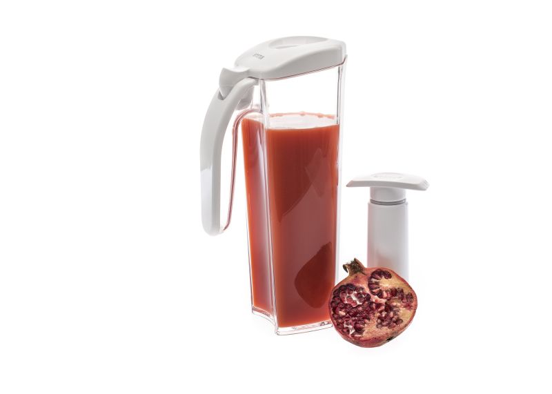 Вакуумна кана за съхранение на прясно изцедени сокове и смутита. Забавя процеса на окисляване между 3 и 4 пъти и респективно удължва до 4 пъти срока им на годност. Подходяща е също така за мляко, домашни лимонади, коктейли и лате. Вакуумното съхранение запазва хранителната стойност и свежестта на напитките. Проектирана за поставяне на рафта за бутилки на вратата на хладилника. За вакуумирането е ноебходима помпа, която не е включена. Произведена в Словения.
