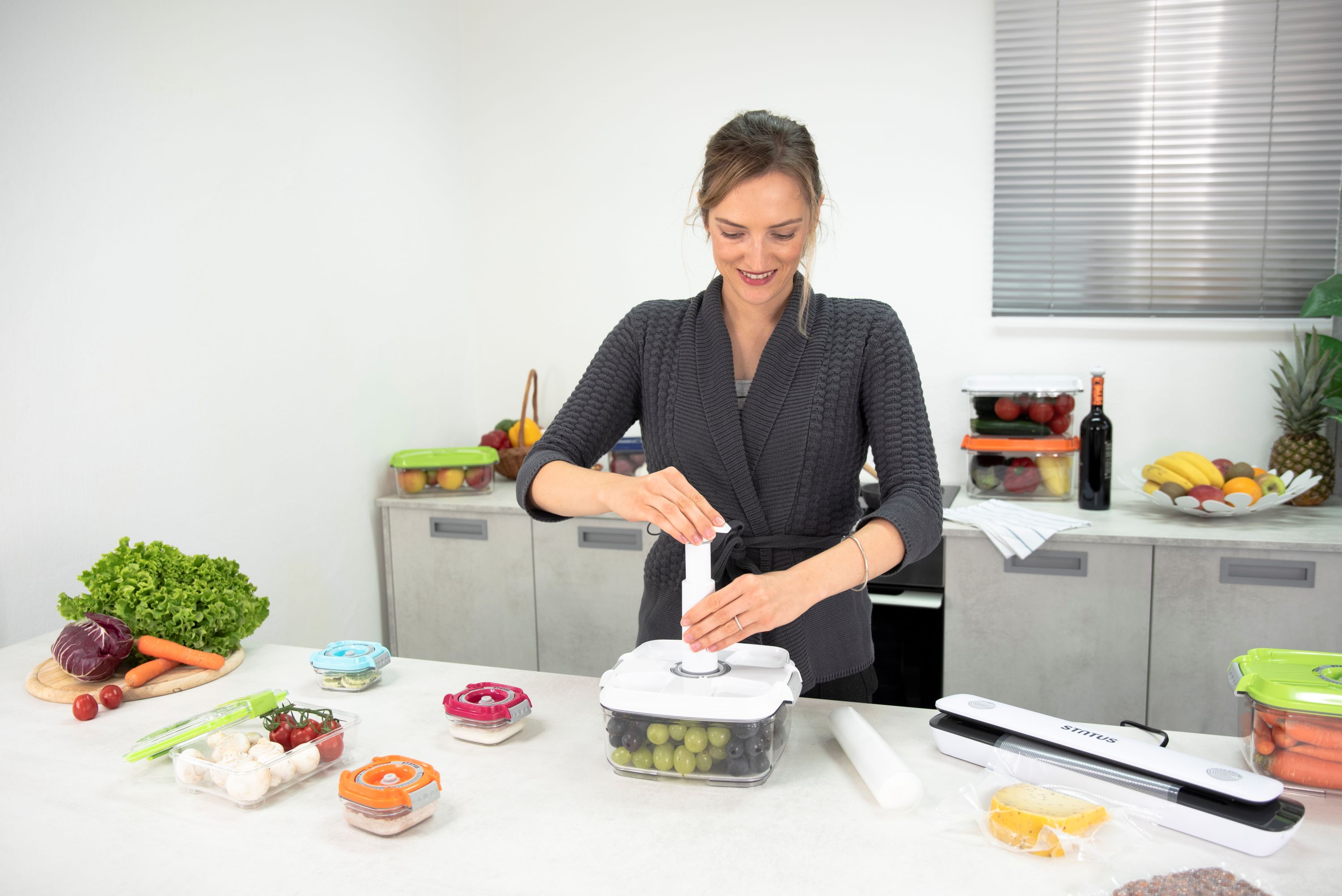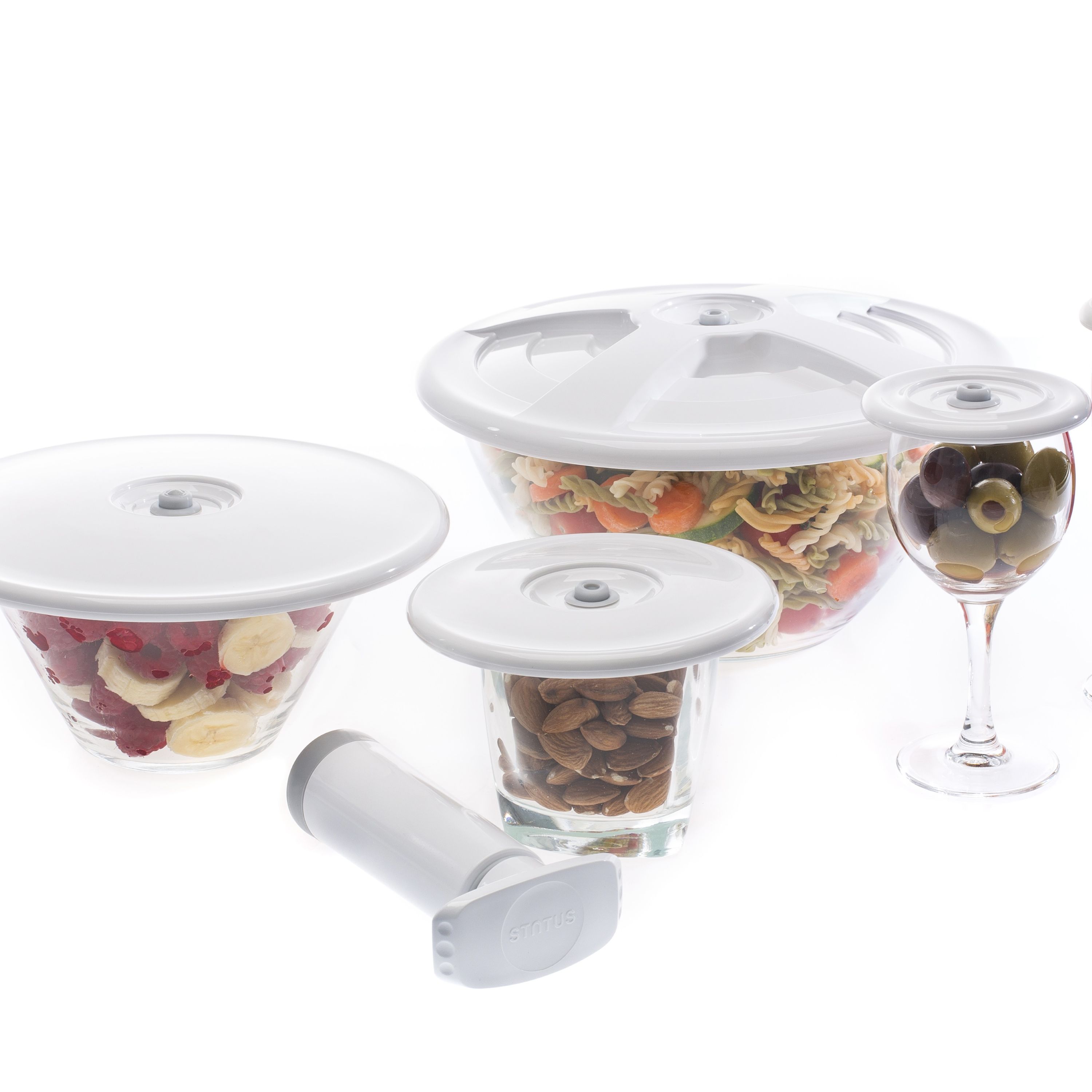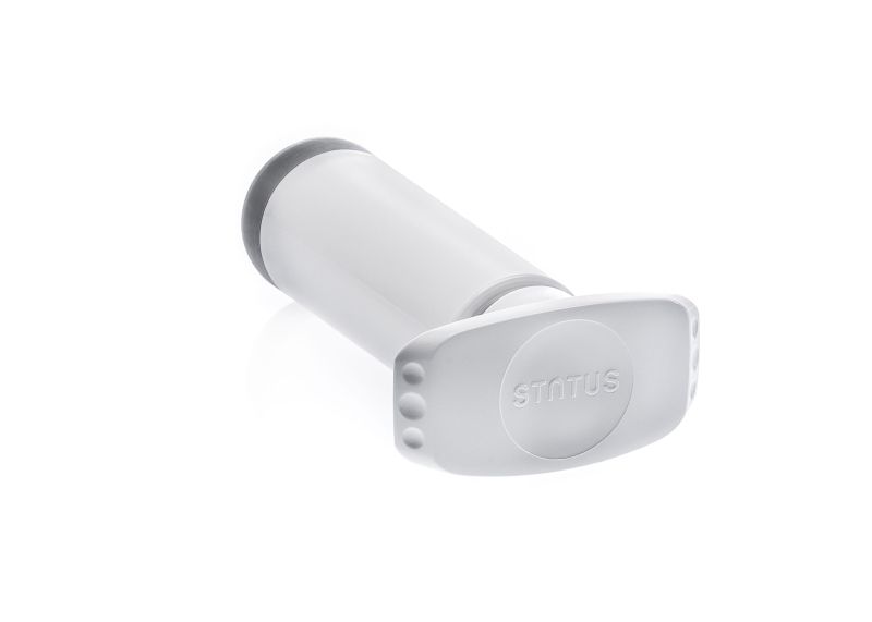 Вакуумирането с ръчната помпа е лесно, защото не изисква батерии и периодично зареждане. Поставете помпата натискайки леко около вентила на вакуумния контейнер, кана, тапа или универсален капак и помпайте докато възвратното движение стане трудно. Това означава, че сте постигнали желаното ниво на вакуум в съда. Времето, респективно броят напомвания зависи от големината на съда и количеството храна/течност в него. Обикновено, това са не повече от 5-6 напомвания. След това няма да можете да отворите капака или да извадите тапата ако не изместите с пръст винтила настрани. Ще чуете еднократно „пссс...“ от навлизането на въздух обратно в съда. Можете да я използвате за вакуумно съхранение с всички контейнери и аксесоари на STATUS.