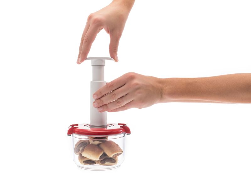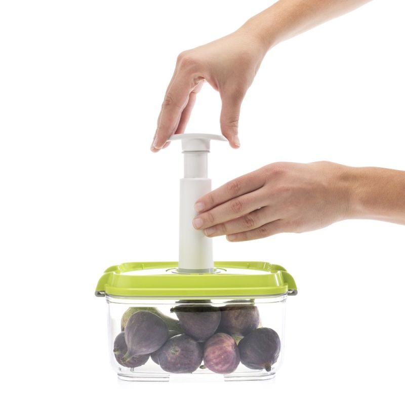 Използвайте ръчната вакуумна помпа, за да вакуумирате и съхранявате качествено вашите плодове и зеленчуци, брашно, кафе, билки, готови ястия или други хранителни продукти. Така запазвате свежестта, натуралния цвят, аромата и хранителната стойност на продуктите. Вакуумното съхранение също предотвратява разпространението на неприятни миризми във вашия хладилник и кухня.