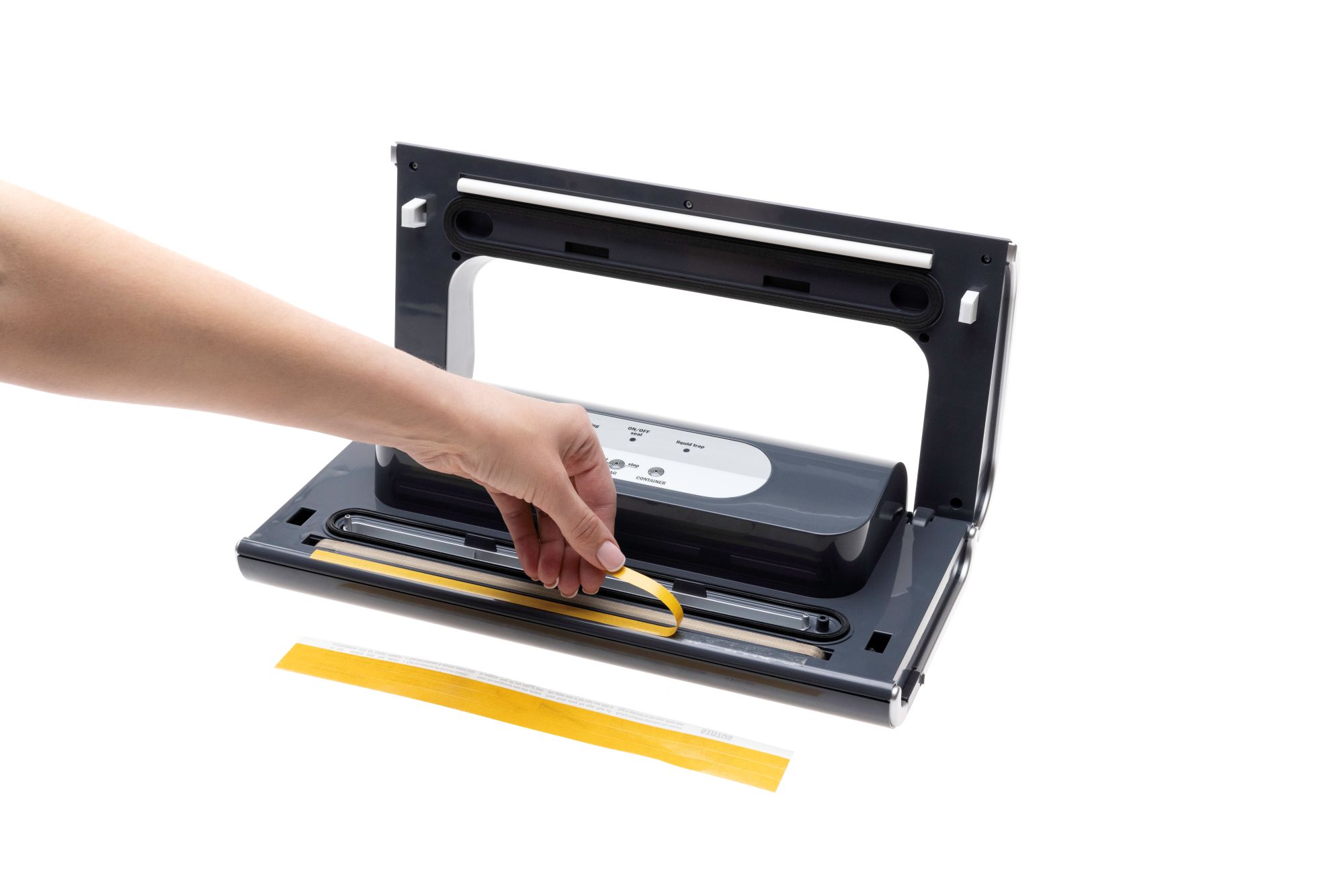 Откъснете една двойнозалепващата лента Status Stiki от комплекта и отлепете белия защитен слой. Залепете лентата към корпуса на уреда под негреваемата лента за запечатване. Отлепете жълтия защитен слой.