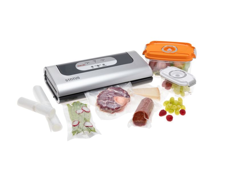 Вакуумната машина STATUS Home 280 има три функции за опаковане на различни храни. Автоматичното вакуумно запечатване без заключване на капака е идеално за сухи и твърди храни (сушени меса, ядки, твърдо сирене). Ръчното вакуумно запечатване е за влажни и деликатни храни като прясно месо, плодове и зеленчуци. В този случай използвайте бутона за старт и стоп, за да спрете помпата, преди течността да достигне запечатващата лента или преди храната да се смачка и деформира. Използвайте бутона Container, за да вакуумирате контейнери и други вакуумни аксесоари на STATUS. Това е отлично решение и за съхранение на течности с контейнерите тип вакуум кана.