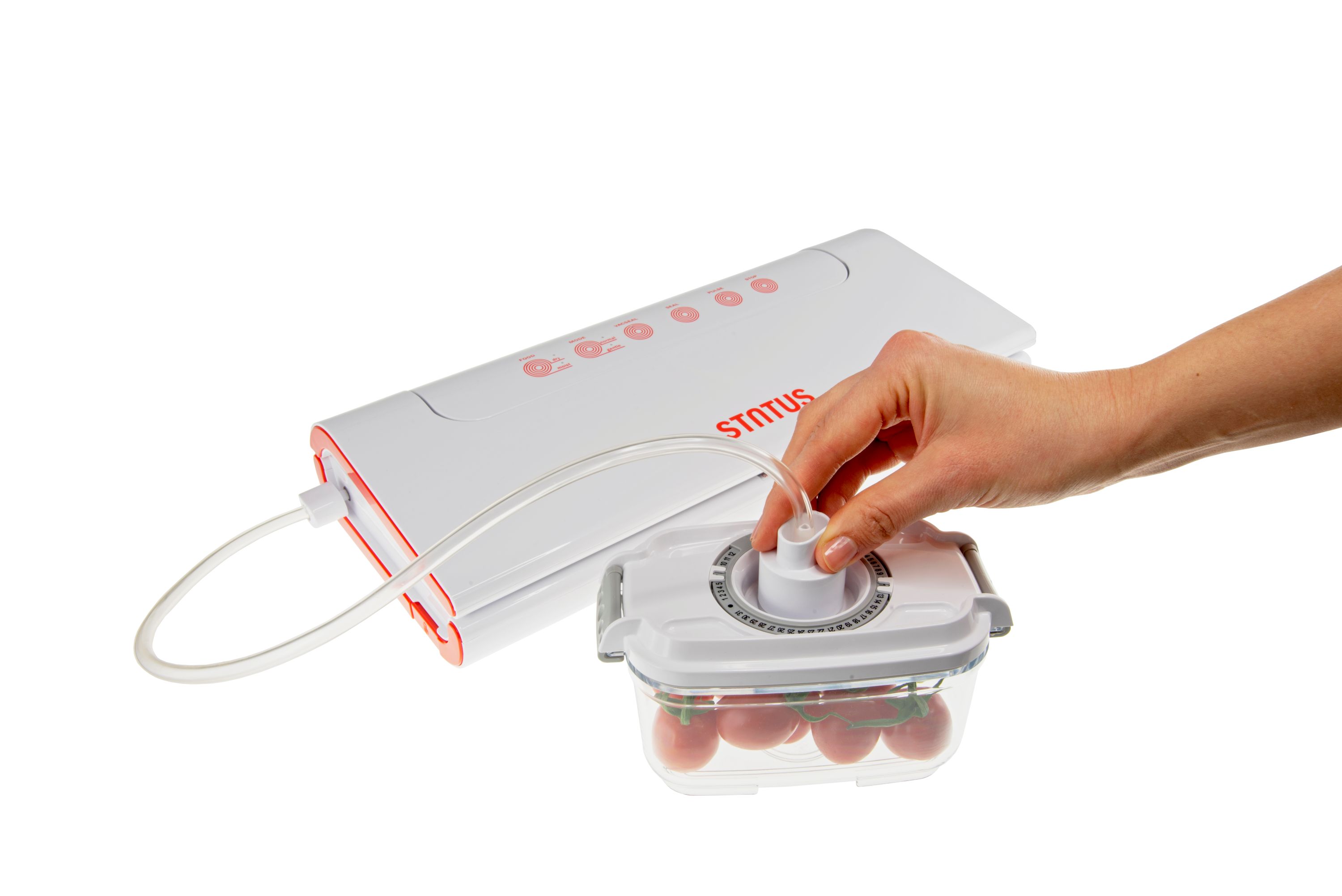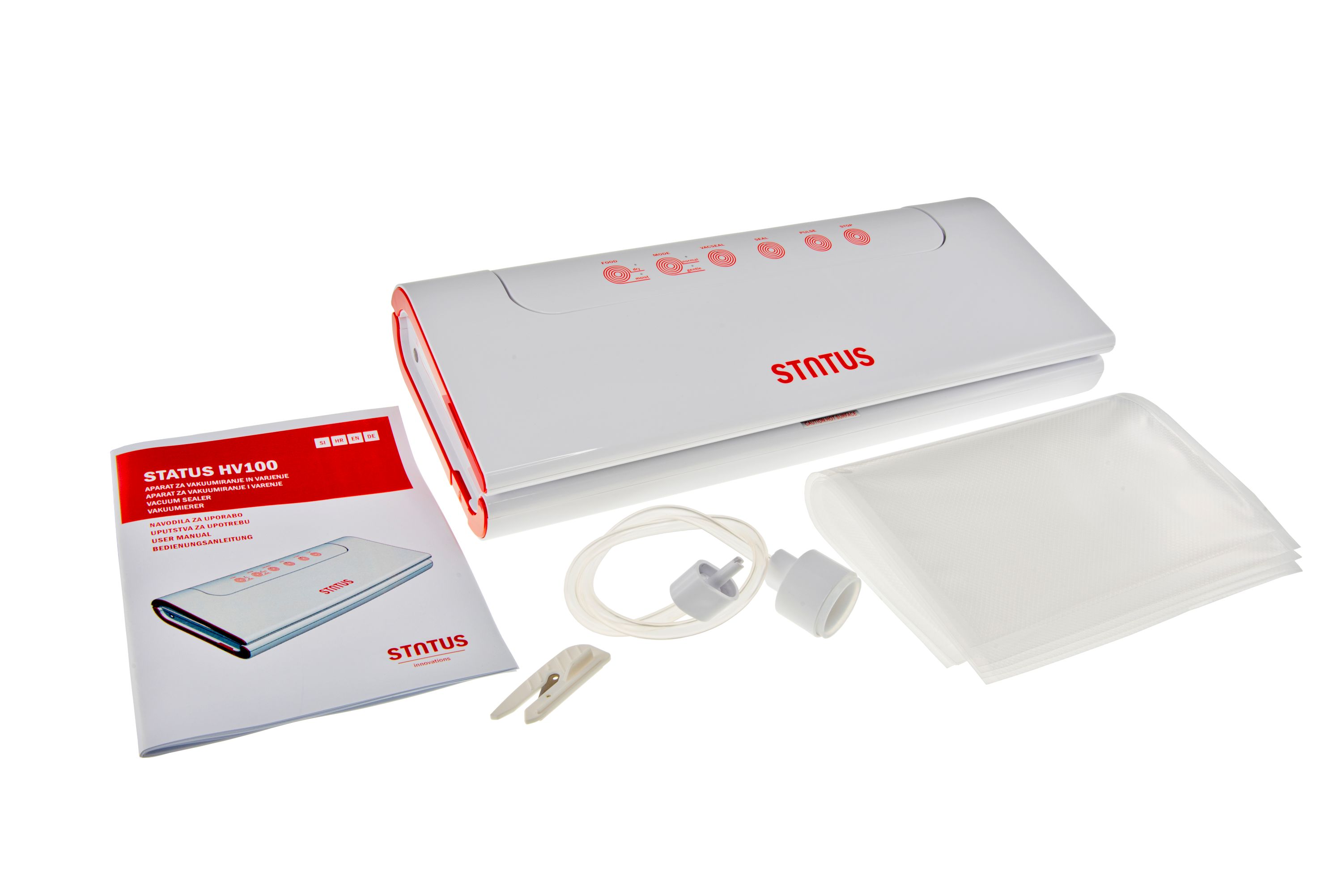 HV100 се продава в комплект с приставка за ваккумно запечатване на вакуумни контейнери, кани, съдове с универсални вакуумни капаци STATUS, тапи за бутилки и други подобни аксесоари. При тях използвате ръчния режим “Pulse” и запечатвате безопасно ежедневно останалата храна в хладилника, сокове, безалкохолни напитки и сладкиши или деликатни продукти, които биха се смачкали в торбичките. Таблица за сроковете на съхранение на различните видове продукти в хладилник и фризер, може да намерите изтегляйки Указанието за употреба по долу.